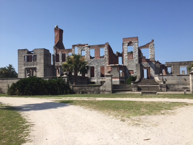 Ruins. Especially those found on a beautiful remote island in South Georgia are especially fascinating to me. James Oglethorpe first built on Cumberland Island in 1736, building a hunting lodge that he named Dungeness. In the 1880s the property was purchased by Thomas M. Carnegie, brother of Andrew Carnegie, who began to build a new mansion on the site. The 59-room mansion and grounds were completed after Carnegie’s death in 1886. Just imagine the glorious oyster roasts and low counrty cookouts and parties they had on the ocean front view!